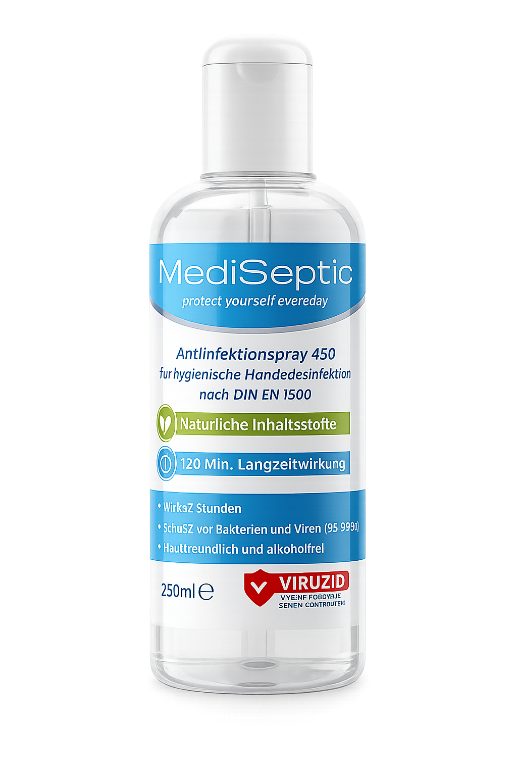 Chlordioxid-basiert, alkoholfrei, DIN EN 1500 zertifiziert — 120 Minuten echter Schutz.